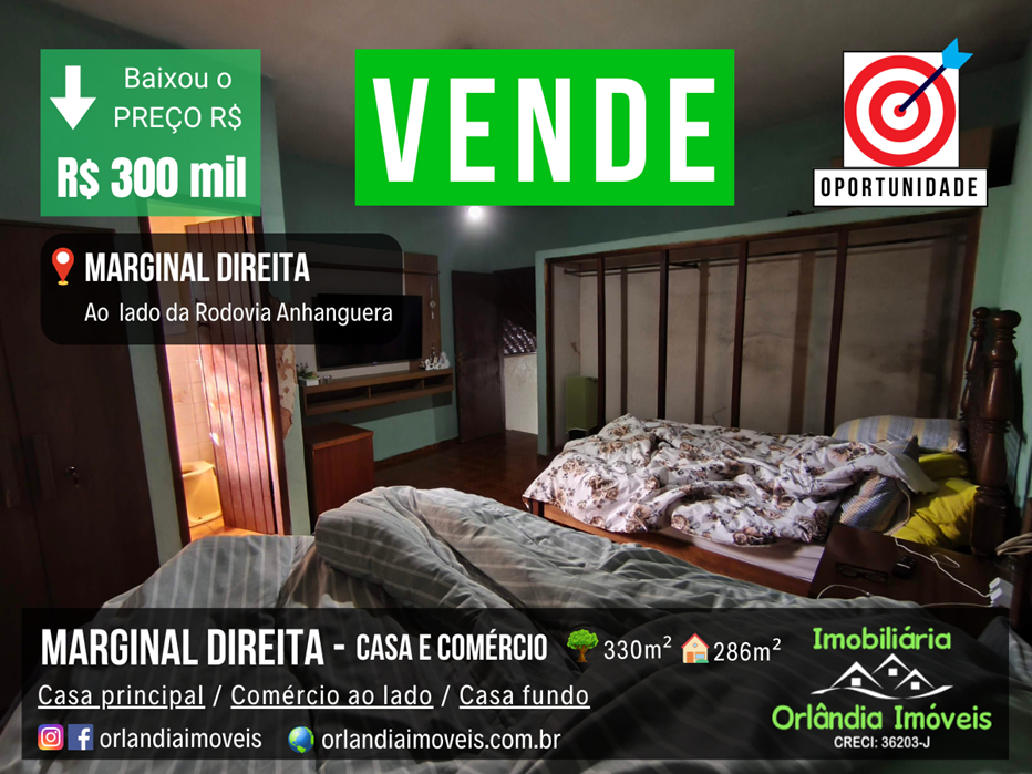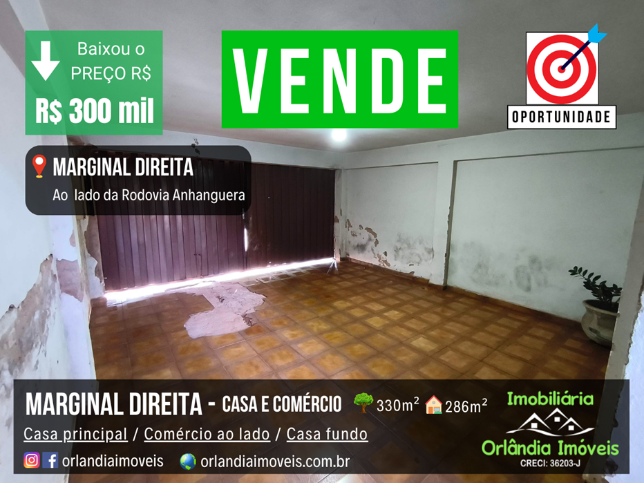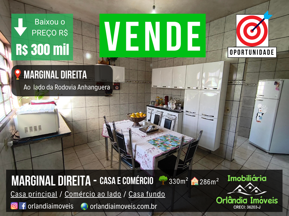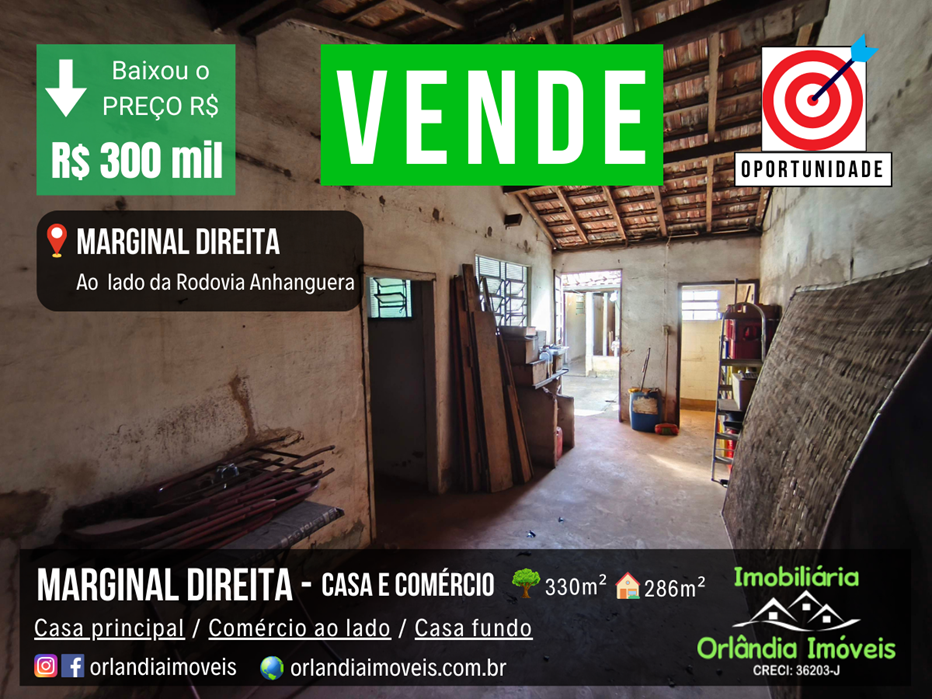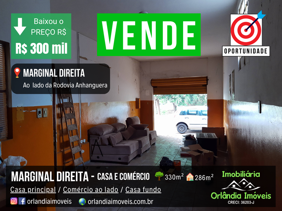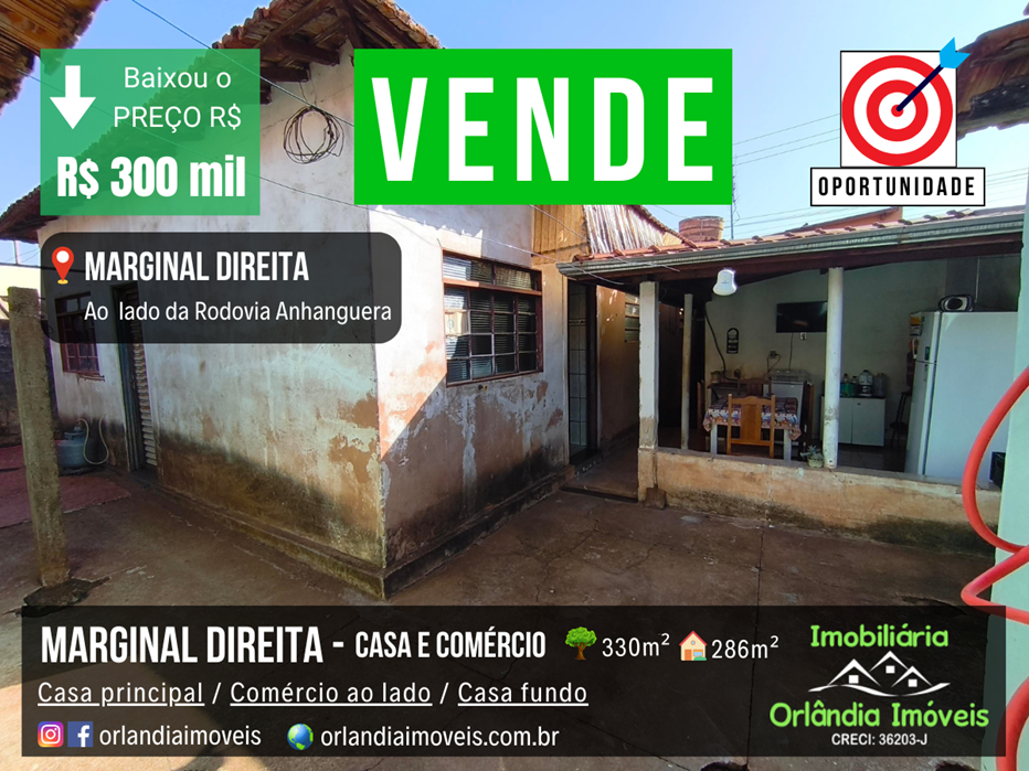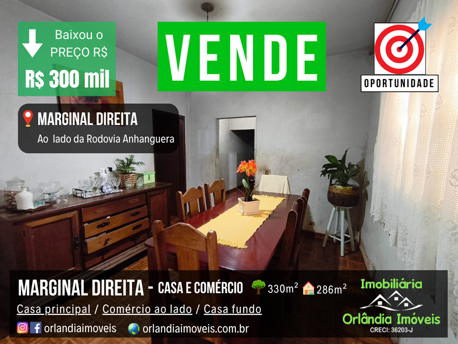 Oportunidade! Vende-se Casa e Comércio na Marginal Direita ao lado da Rodovia Anhanguera, na cidade de ORLÂNDIA, SP. Excelente investimento para montar comércio e serviços em geral ou também para investimento em 03 locações (casa principal, casa no fundo e comércio ao lado).