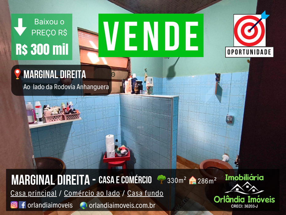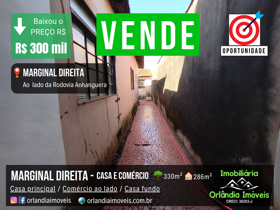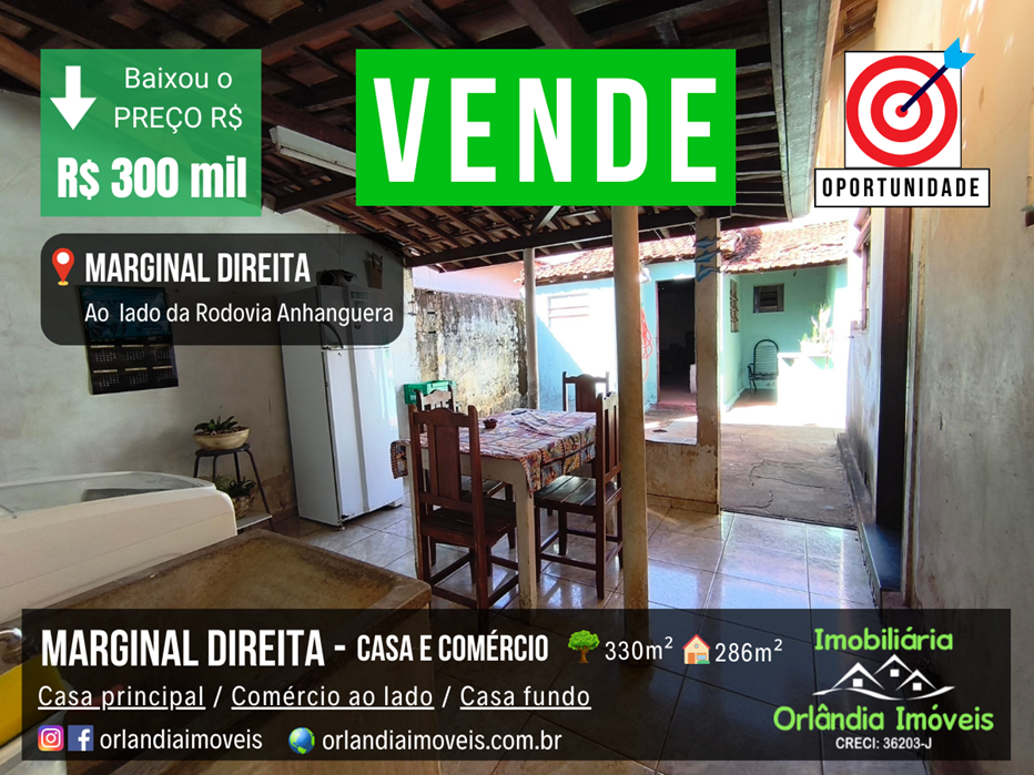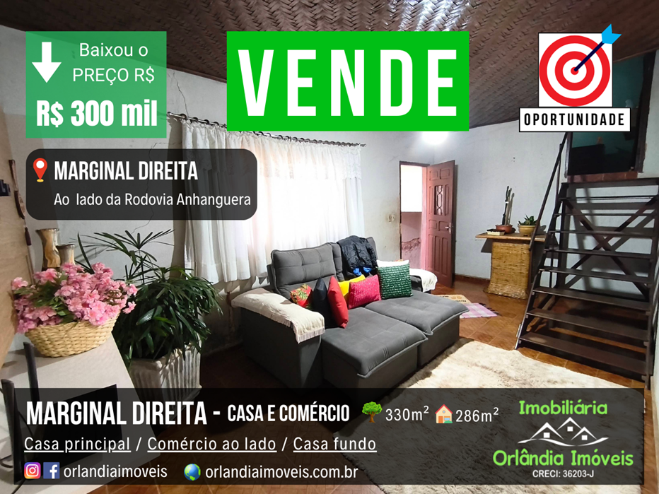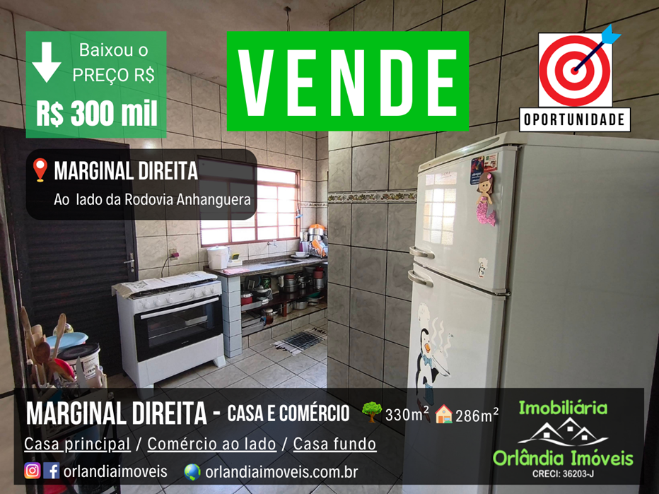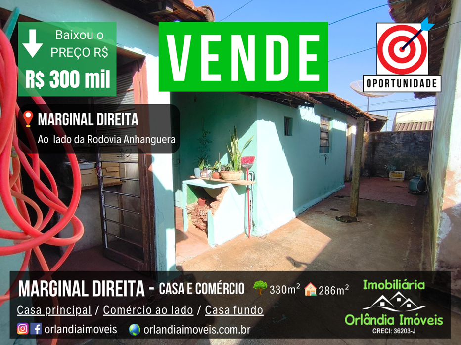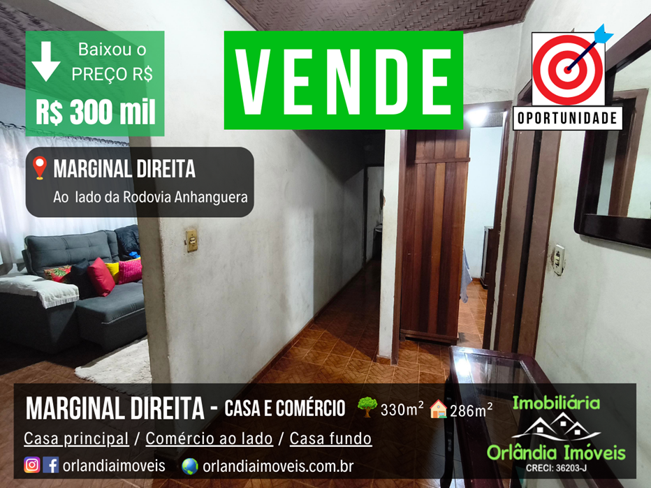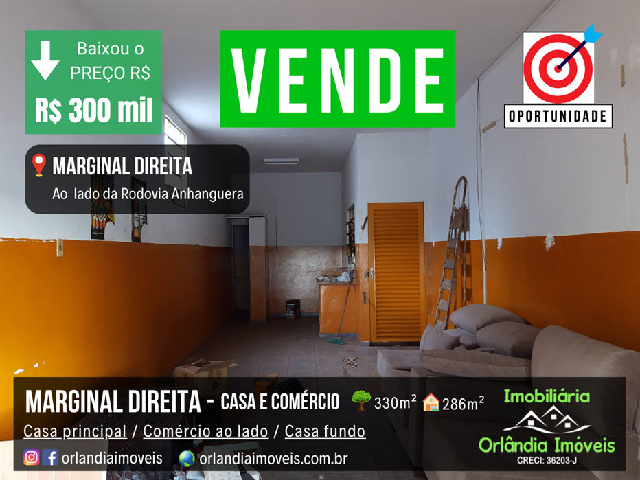 Oportunidade! Vende-se Casa e Comércio na Marginal Direita ao lado da Rodovia Anhanguera, na cidade de ORLÂNDIA, SP. Excelente investimento para montar comércio e serviços em geral ou também para investimento em 03 locações (casa principal, casa no fundo e comércio ao lado).